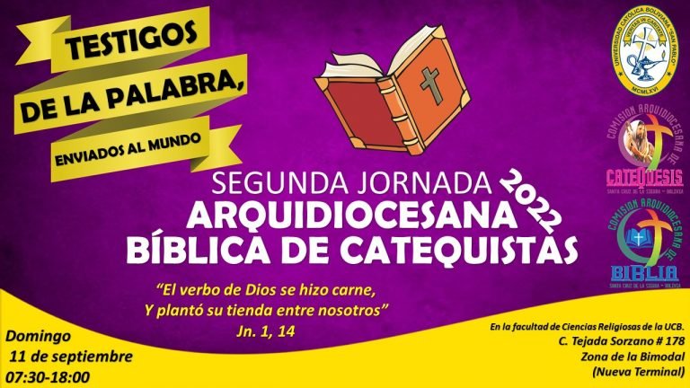 Radio Betania 08-09.2022 La Comisión Arquidiocesana de Catequesis y Biblia en coordinación con la Universidad Católica Boliviana convocan a los Catequistas de Iniciación Cristiana de Bautismo, niños, jóvenes, adultos y parejas guías; a participar de la Jornada Bíblica de Formación con el objetivo de formar y ofrecer a los catequistas nuevos acercamientos al evangelio según san Juan (Literario, teológico e histórico) a la luz de los desafíos que representa el contexto. Bajo el lema «Testigos de la palabra, enviados al mundo»