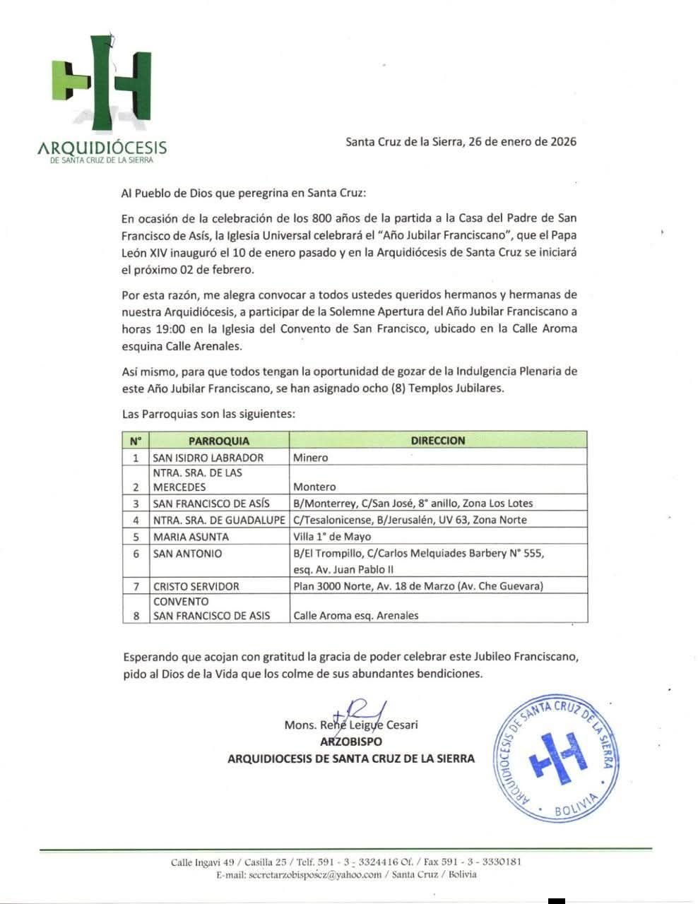En la arquidiócesis de Santa Cruz Mons. Leigue convoca a todos los fieles a participar de la apertura del Año Jubilar franciscano el día 2 de febrero a las 19:00 horas en la iglesia del convento San Francisco ubicado en la calle Aroma esquina Arenales.