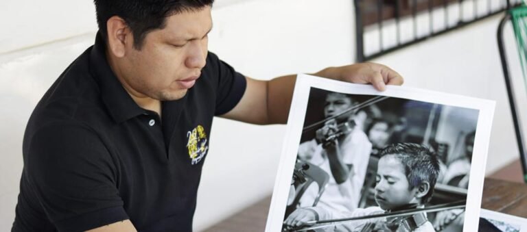¿De cómo se dio esta muestra? “Vi la ternura de un niño con su violín y su propósito de vida como una tarea cotidiana. Entonces sentí la motivación de pintar esta cultura de pueblos vivos”, expresó. “La música barroca, altamente ornamentada y dramática, hizo amistad con mi pintura, dándome el espacio para amplificar el color local usando tonalidades complementarias, poniendo capas diferentes y matices vibrantes”.