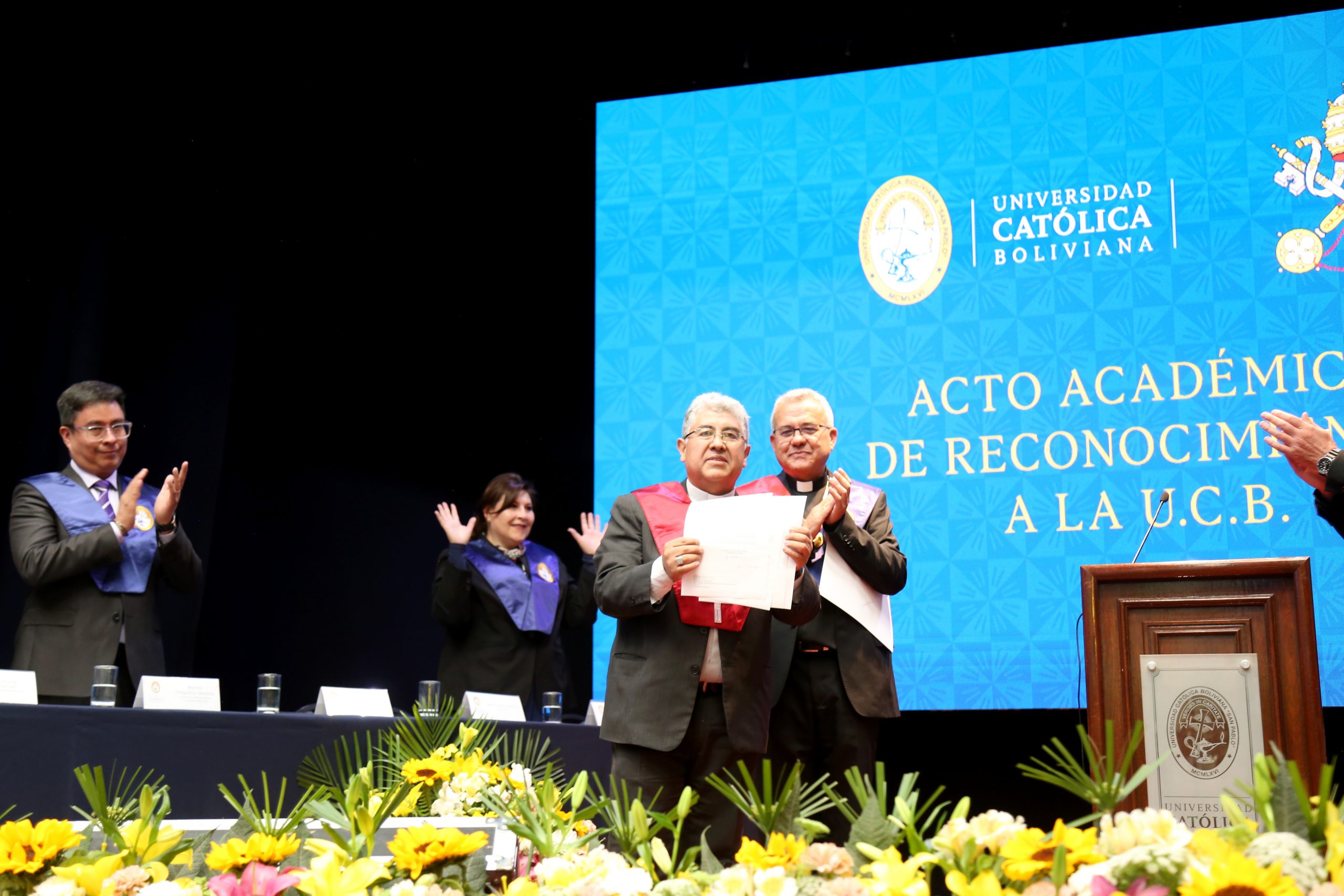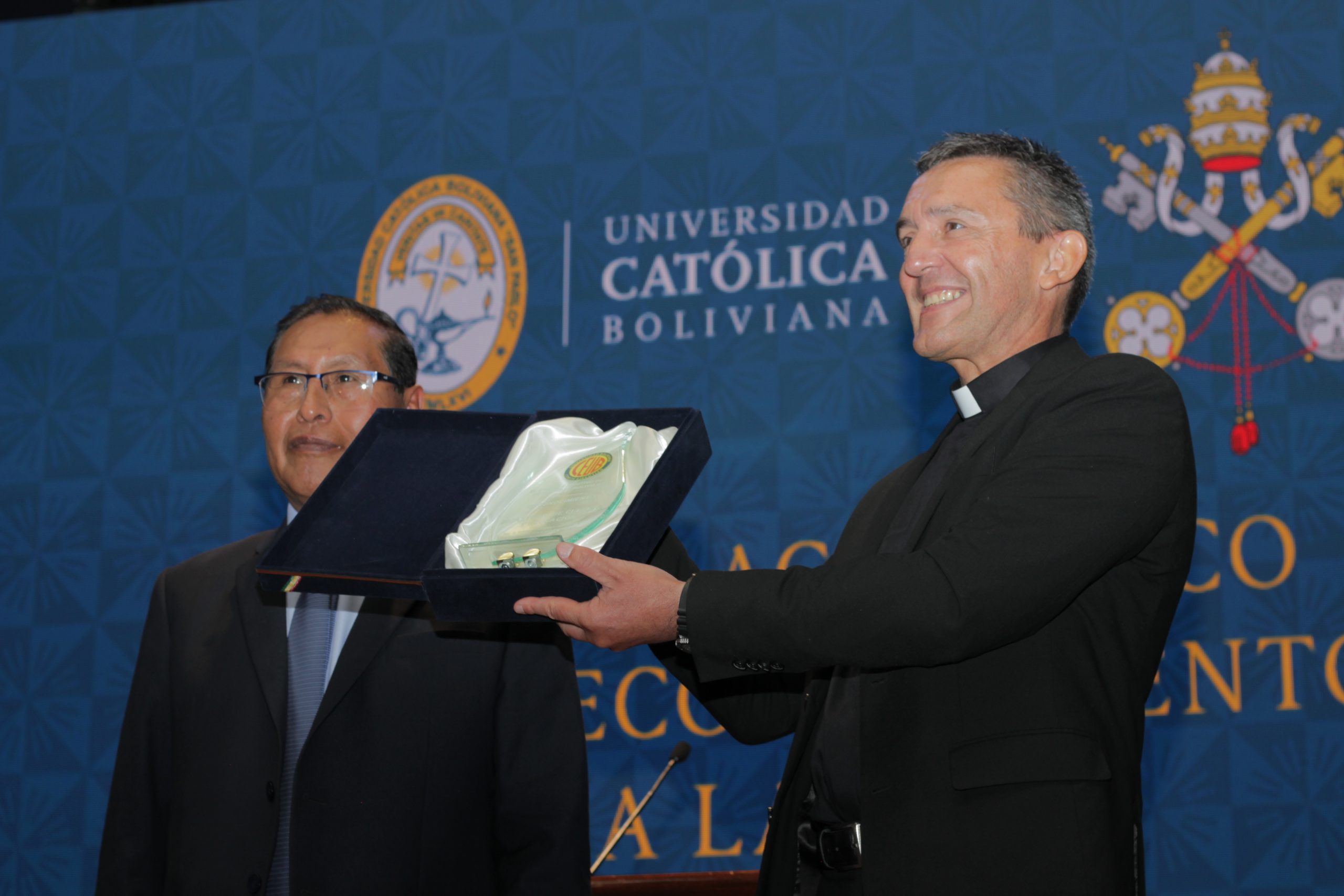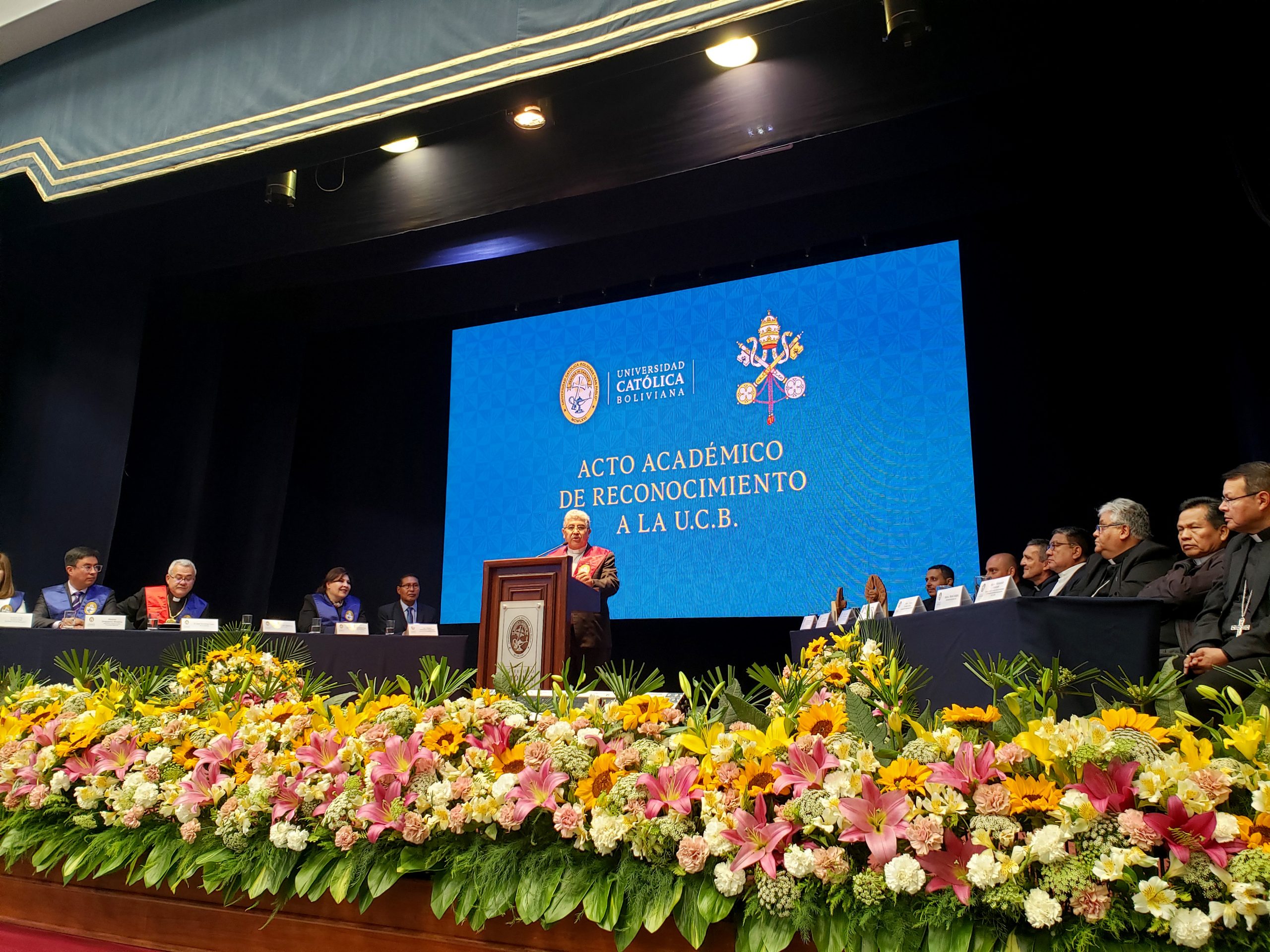 Mons. Giovanni Cesare Pagazzi, Secretario de la Sección Educación del Dicasterio para la Cultura y Educación del Vaticano, hizo la entrega del decreto correspondiente de erección canónica señalando que el Dicasterio para la Cultura y la Educación, y que equivale al Ministerio de Instrucción del Vaticano, se ocupa de la instrucción primaria, secundaria en 260.000 establecimientos, y en la educación superior alcanzando a cerca de 1.700 universidades católicas en el mundo de las que solo 53 han recibido la distinción que hoy se da a la Universidad Católica Boliviana “San Pablo”.