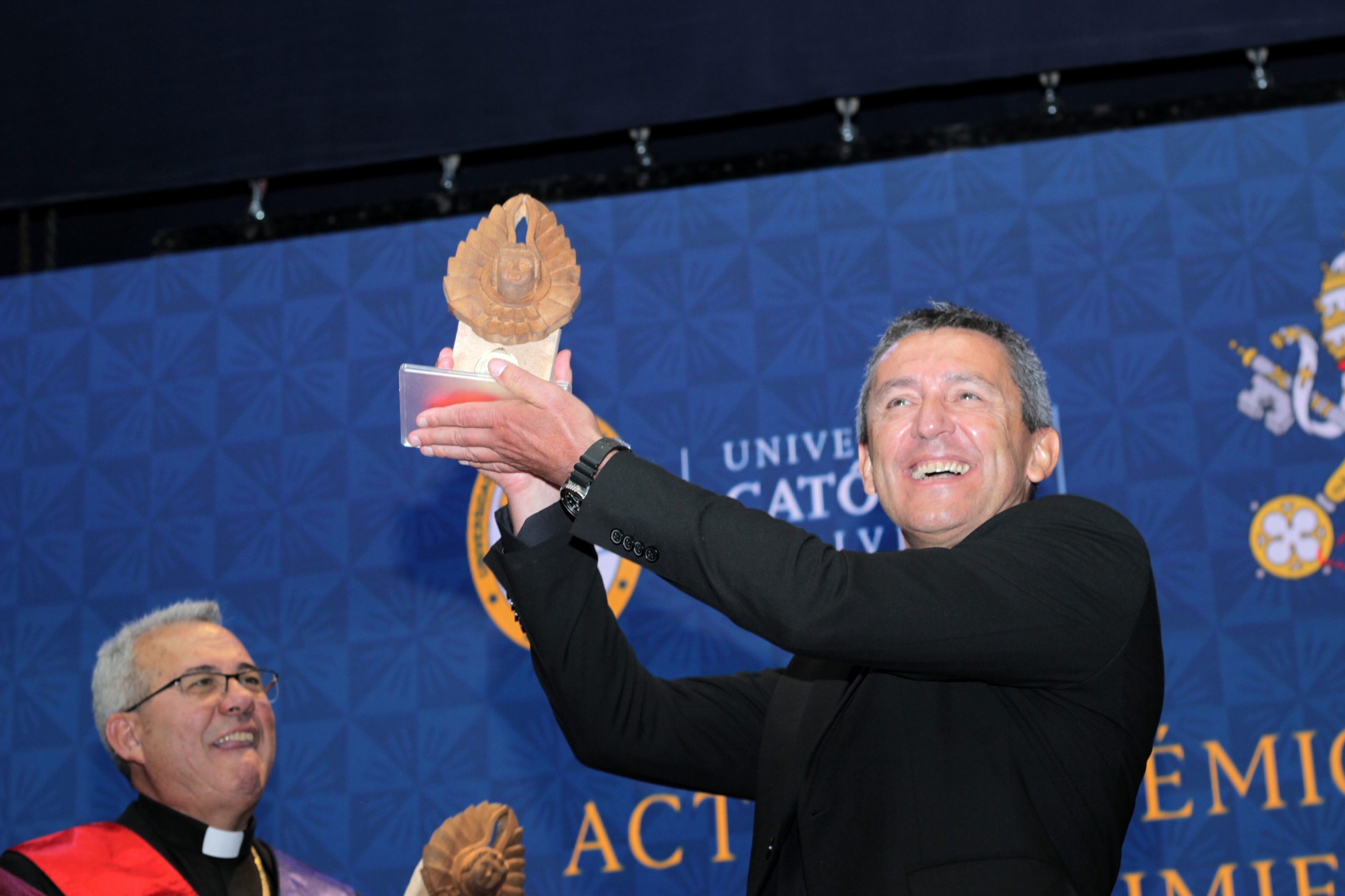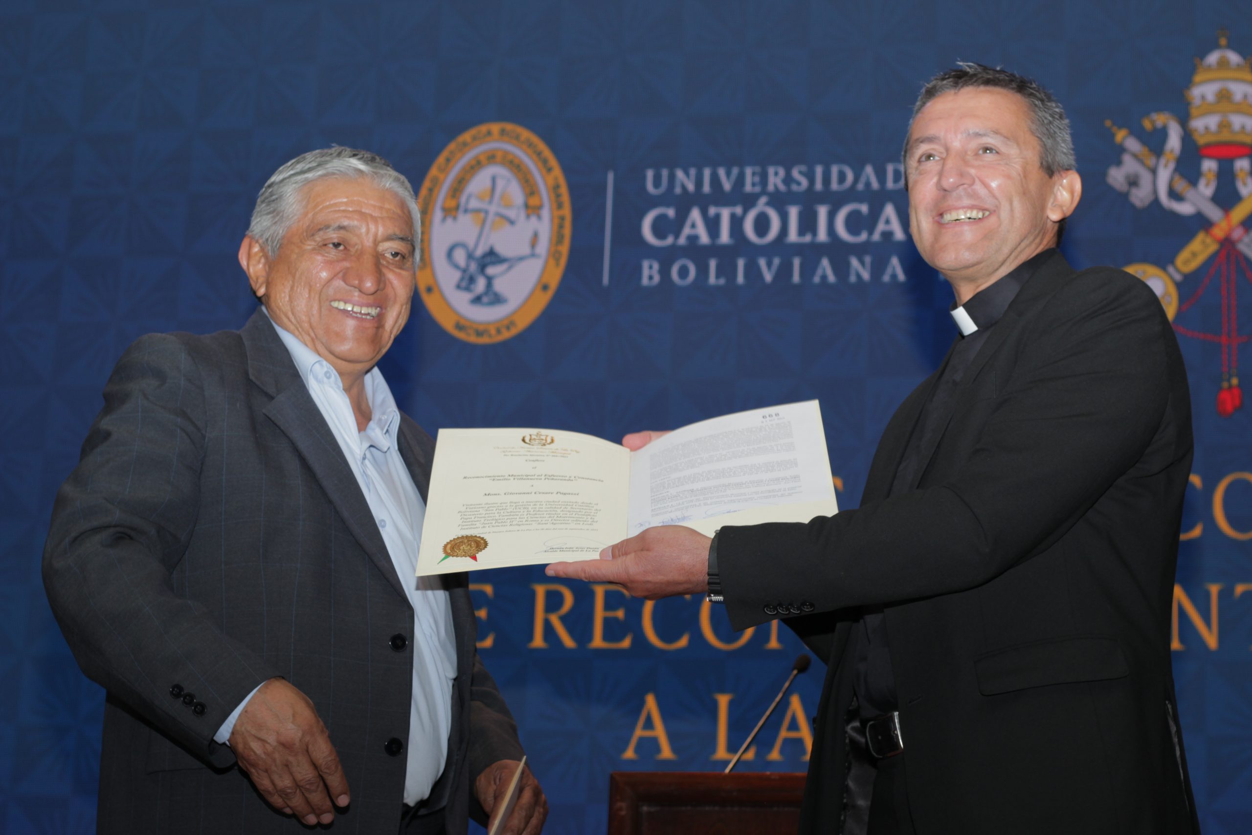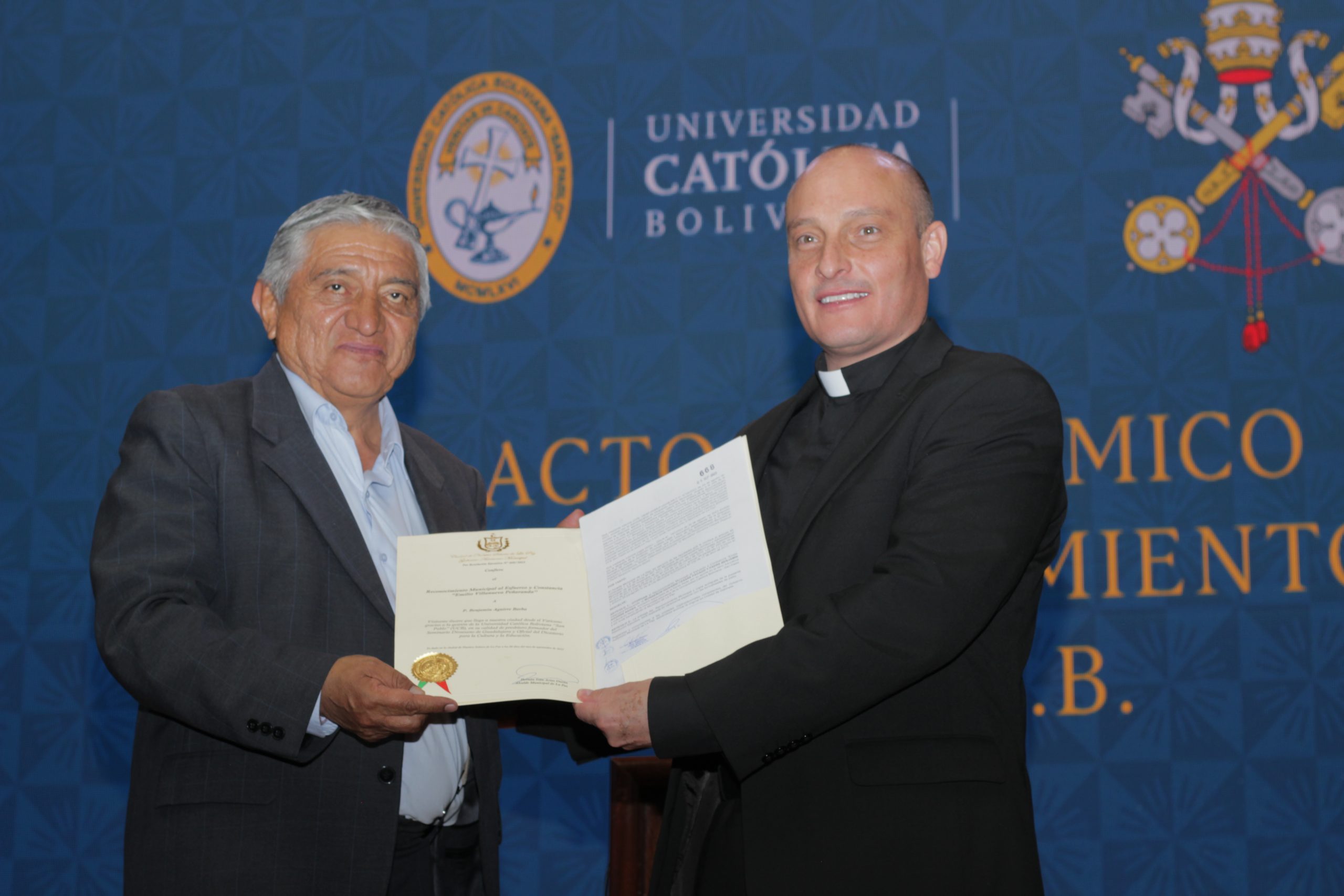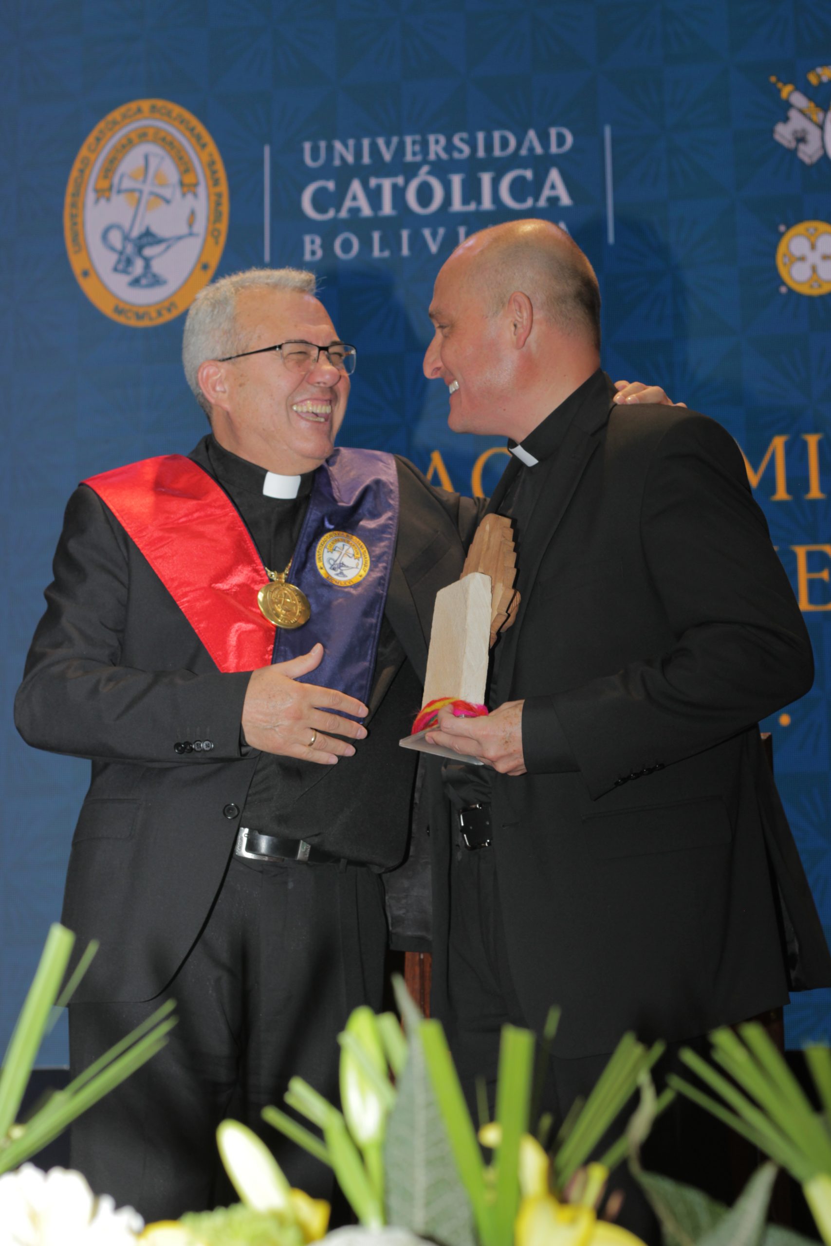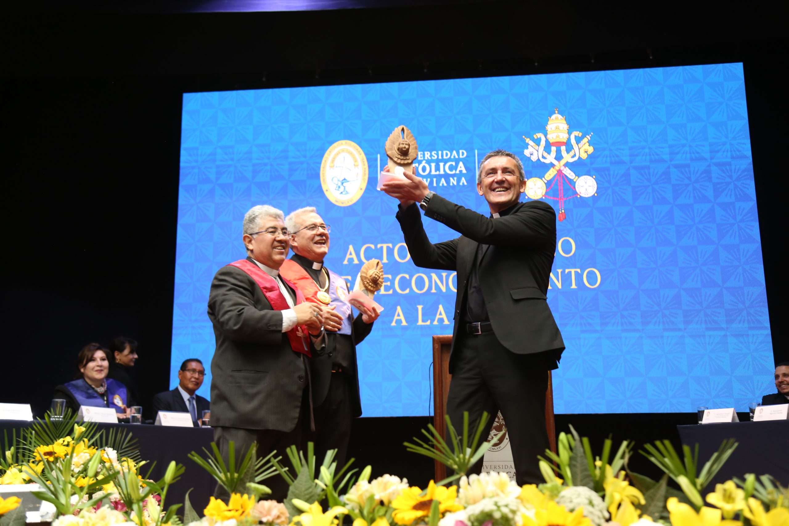 Por su parte, el Rector Nacional de la Universidad Católica Boliviana “San Pablo”, Rvdo. P. José Fuentes Cano agradeció el reconocimiento señalando que este hecho comprometía a la universidad a estar más unidos con el Santo Padre Francisco y promover y empujar su sueño para la humanidad que ha compartido en sus cartas apostólicas y encíclicas: Evangelii Gaudium, Laudato Si, Fratelli Tutti, y el Pacto Educativo Global.