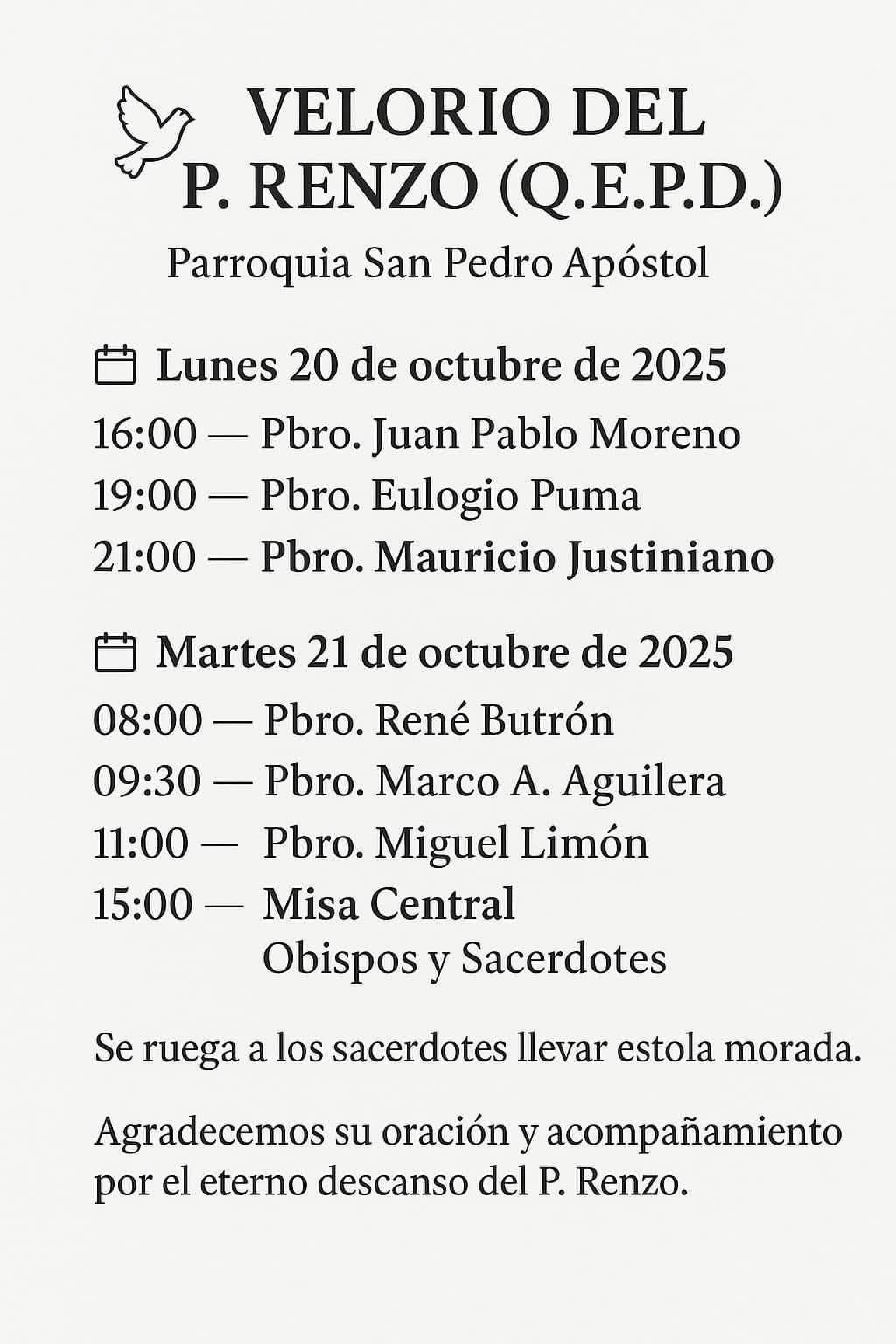 La parroquia San Pedro Apóstol a través de un comunicado en sus redes sociales, lamentó la partida de su párroco este lunes 20 de octubre al promediar las 02:30 am fue llamado a la casa del Padre, después de unos días críticos en terapia intensiva.