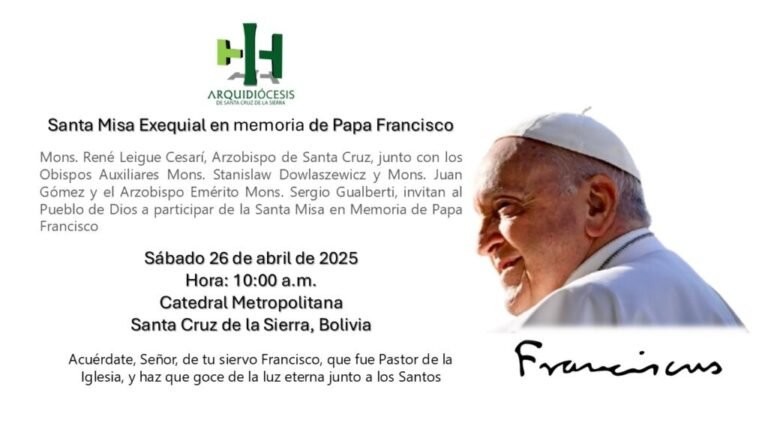 Radio Betania/iglesiasantacruz.org/ Monseñor René Leigue Cesarí, Arzobispo de Santa Cruz, junto con los Obispos Auxiliares Mons. Stanislaw Dowlaszewicz y Mons. Juan Gómez y el Arzobispo Emérito Mons. Sergio Gualberti, invitan con profunda esperanza, en Cristo Resucitado, a todo el Pueblo de Dios a participar de la Santa Misa Exequial en memoria de Su Santidad, el Papa Francisco, Pastor universal de la Iglesia y testigo del Evangelio para nuestro tiempo.